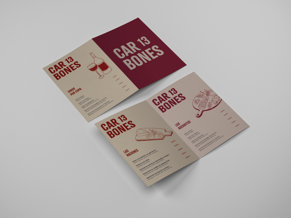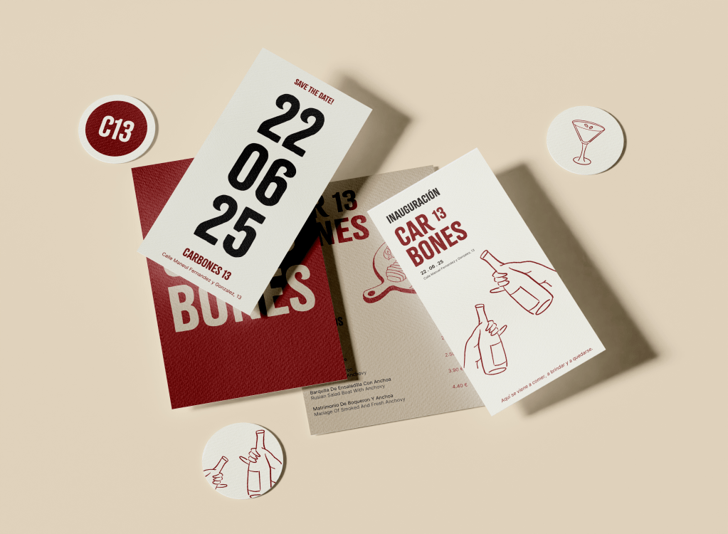 Este proyecto consiste en una renovación gráfica del bar madrileño Carbones 13, con el objetivo de reforzar su identidad y hacer más visible su carácter desenfadado, acogedor y vibrante. A partir de su esencia retro y su espíritu de compartir, la propuesta actualiza el lenguaje visual del espacio mediante una tipografía contundente, una paleta dominada por el color vino tinto y referencias gráficas a los años 80. El rediseño busca acompañar la experiencia del bar y transmitir una atmósfera cálida, informal y con personalidad, coherente con su manera de entender la comida, la música y el encuentro.